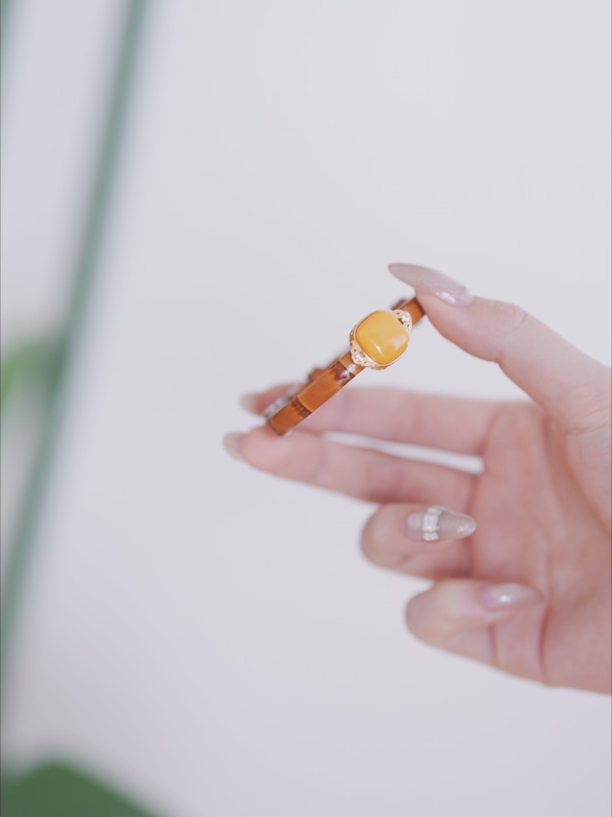 - Materials: 18k Gold-plating on 925 Sterling Silver; Butterscotch Amber; Croc-embossed Leather.